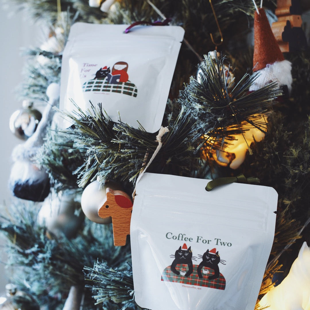 クリスマスツリーのオーナメントにも使える、バステトブレンド30gのコーヒー豆が入っているヨ。30gと言えば、ちょうどコーヒー2杯分ぐらい。