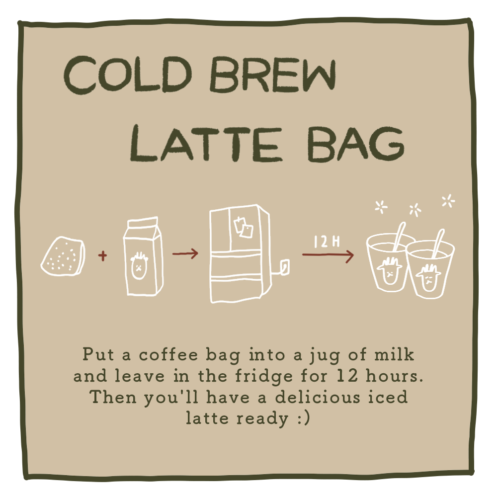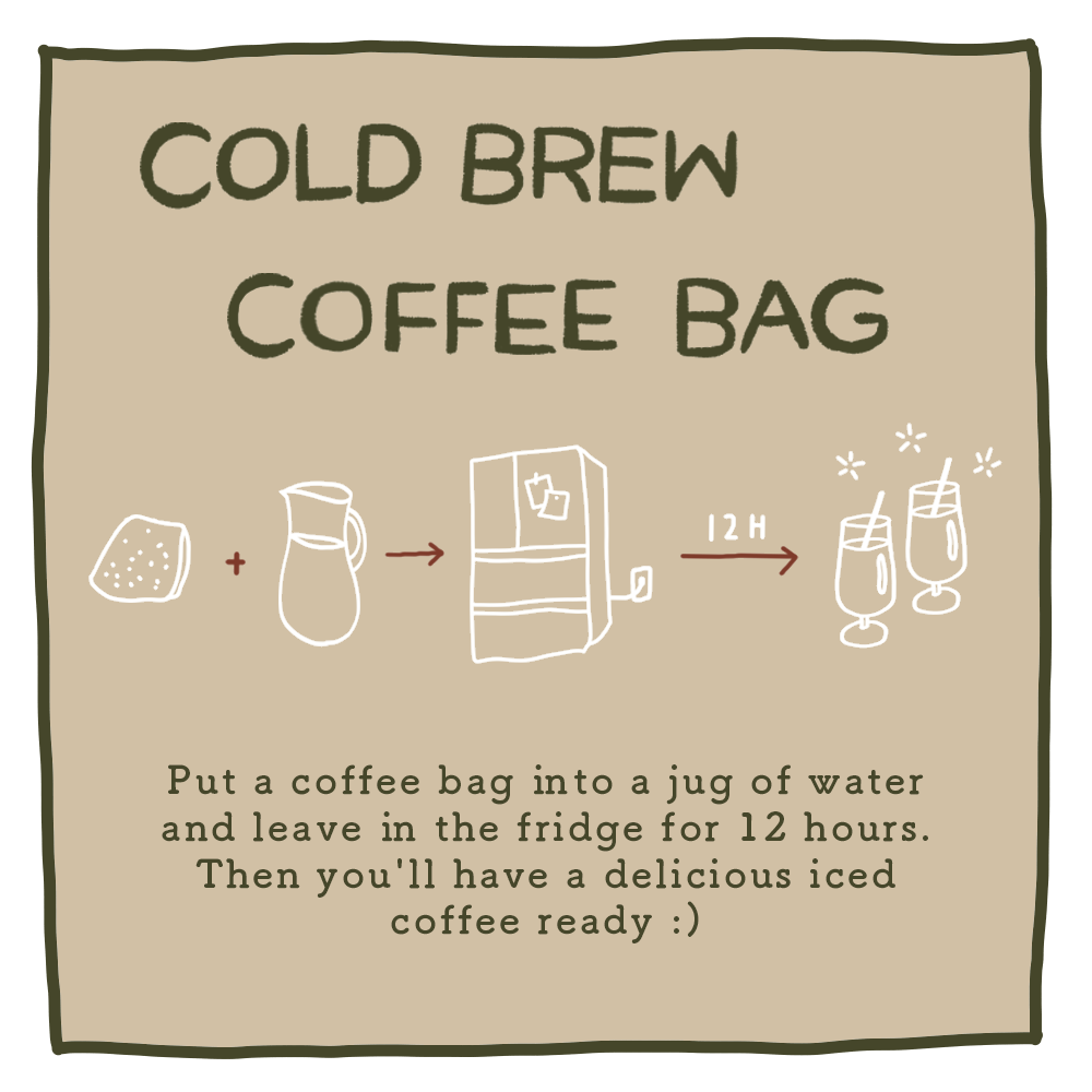 お好みの量の水(だいたい1個で300mlの水ぐらいがおすすめ)に入れ、冷蔵庫で約12時間。かんたんに、おいしいアイスコーヒーの出来上がりです。