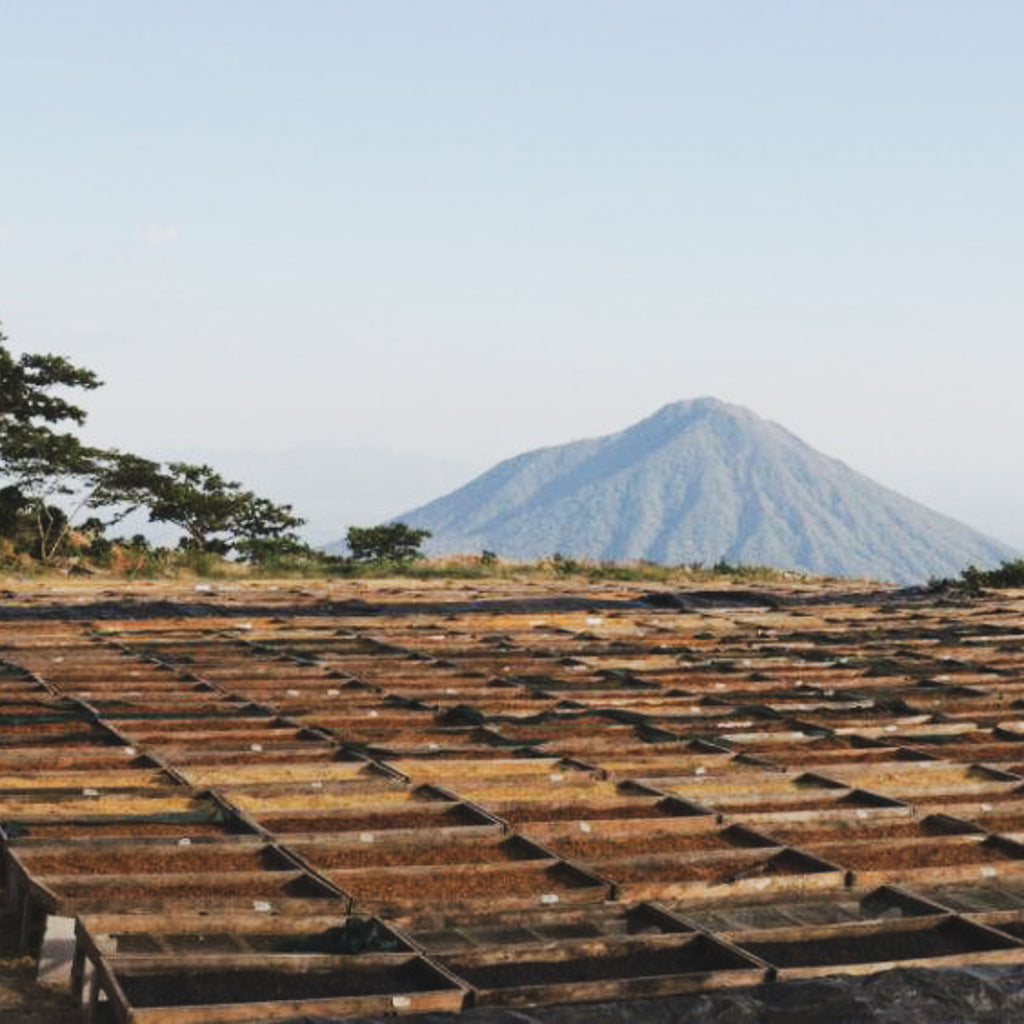 ロス・ピリネオス農園は、テカパ火山を見下ろす人工の台地を備えており、ここにはさまざまな処理方法で精製されたコーヒーのための広大な乾燥ベッドが設置されています。この台地では、一日中日光が当たり、乾燥中の豆に西風が吹き抜けるため、均一で安定した乾燥が可能です。