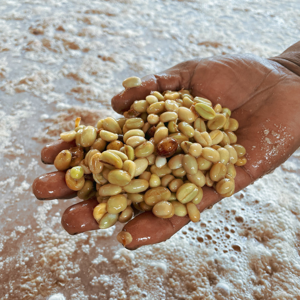 収穫後、機械で果肉を除去(パルピング)し、発酵槽で水洗発酵させるウォッシュドプロセスです。