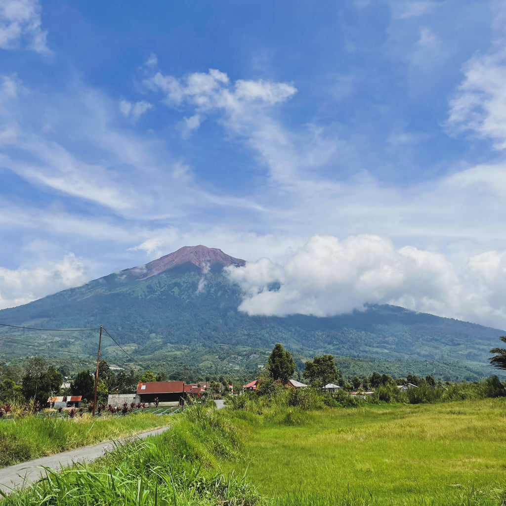 インドネシアのスマトラ島にあるクリンチマウンテン。標高3,000メートルを超え、現地で「神の永住地」とも呼ばれる美しい山で、国立公園にも指定されています。山の高さも、形もまるで富士山のよう。そのクリンチマウンテンのふもと、標高1,500メートルほどのところでコーヒーが栽培されています。カユアロ地域、カユアロバラット地域、グニュントュジュ地域の3つにまたがる地域一帯がコーヒーの生産地です。霧がかかっているかと思うと青空が顔をのぞかせ、晴れたかと思うと雨が降る、天候の変わりやすい地域です。